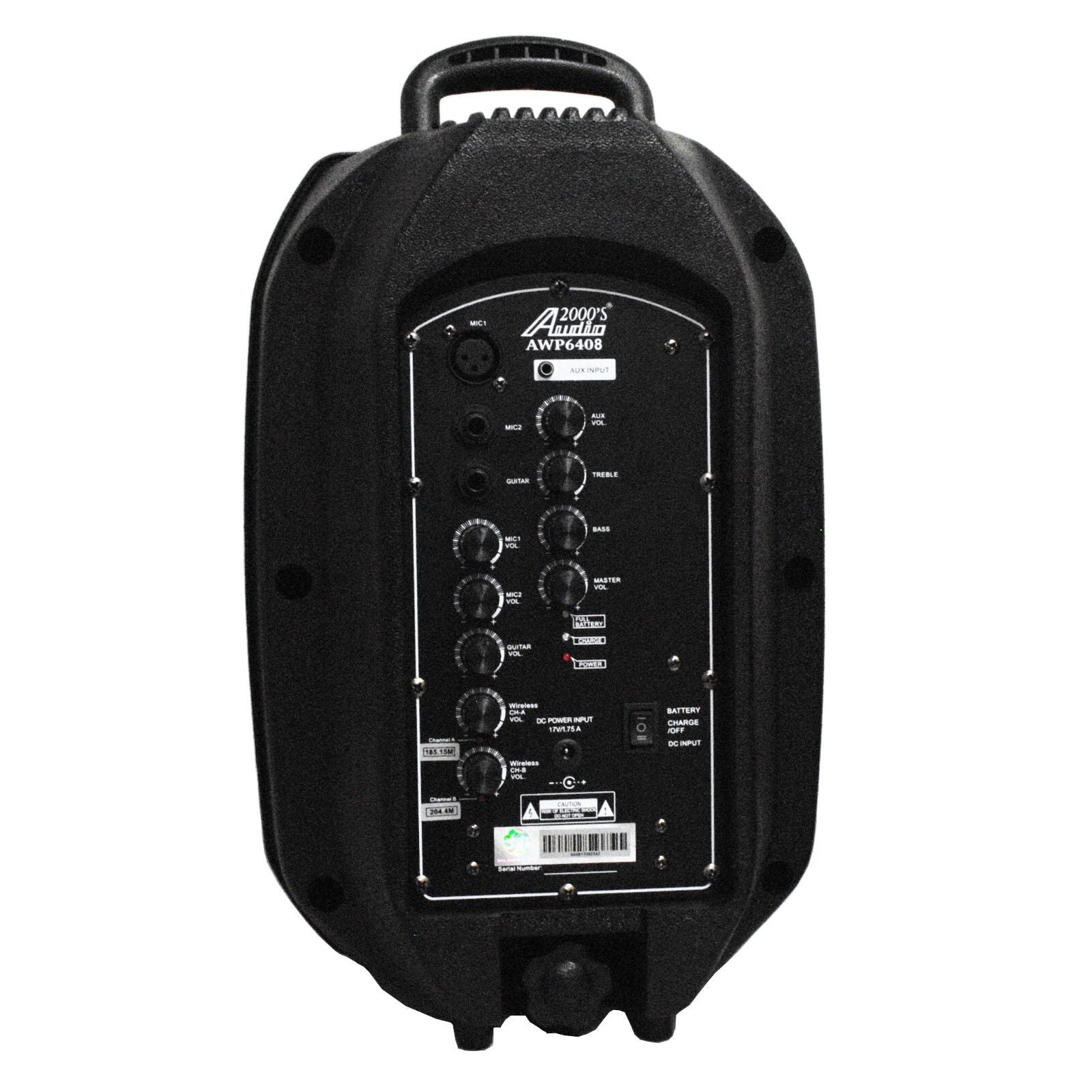 The Audio2000's AWP6408LL portable all-in-one wireless PA system with a long-life rechargeable battery is a portable self-contained PA system built in with 8" woofer, 1" tweeter, wireless microphone system, amplifier and speaker. The above dual channel wireless microphone system includes two wireless transmitter which can be used simultaneously without any interference. The 3.5mm AUX input connector allows you to play the music by plugging in your CD player or an MP3 player including ipod while using the PA for speaking or singing. The combination of the built-in amplifier and the speaker of the AWP6408LL provide 50W power output to achieve effective PA applications. This PA system can do charging & operating at the same time. The handheld transmitter is equipped with MUTE switch when slide the On/Off button to middle. Overall, the AWP6408M is designed and manufactured to be a versatile, user-friendly, convenient and reliable system has been widely used among such as teachers, auctioneers, studio instructors, sales promotion and etc.