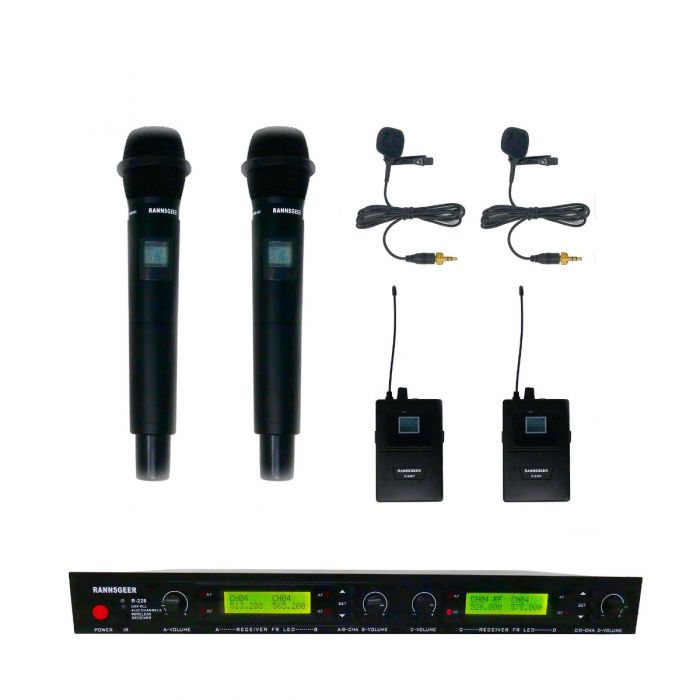 Rannsgeer UHF 4 Channel 128 User Selectable Frequency Wireless Microphone, Rackmountable. 2 Handheld & 2 Lapel Combo System