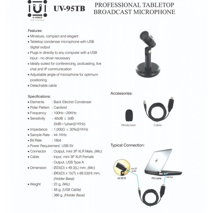 • Condenser microphone with USB digital output compatible with PC, Laptop. Plug in directly to any PC/Laptop with USB input, no driver necessary