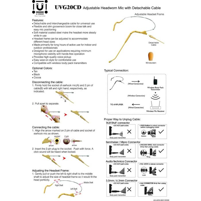 U-Voice UVG20 Tan Color Headset Microphone with Straight Detachable Cable for Audio Technica (Straight Cable)